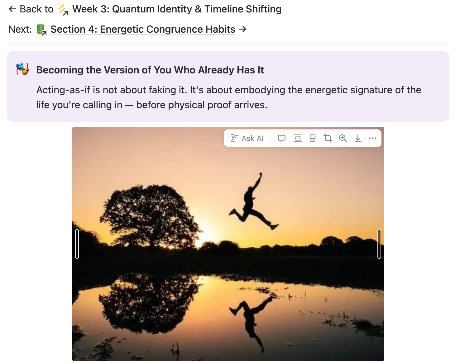An 8-week program combining daily practices, quantum principles, energetic alignment, meditations, and somatic practices into one transformative roadmap.